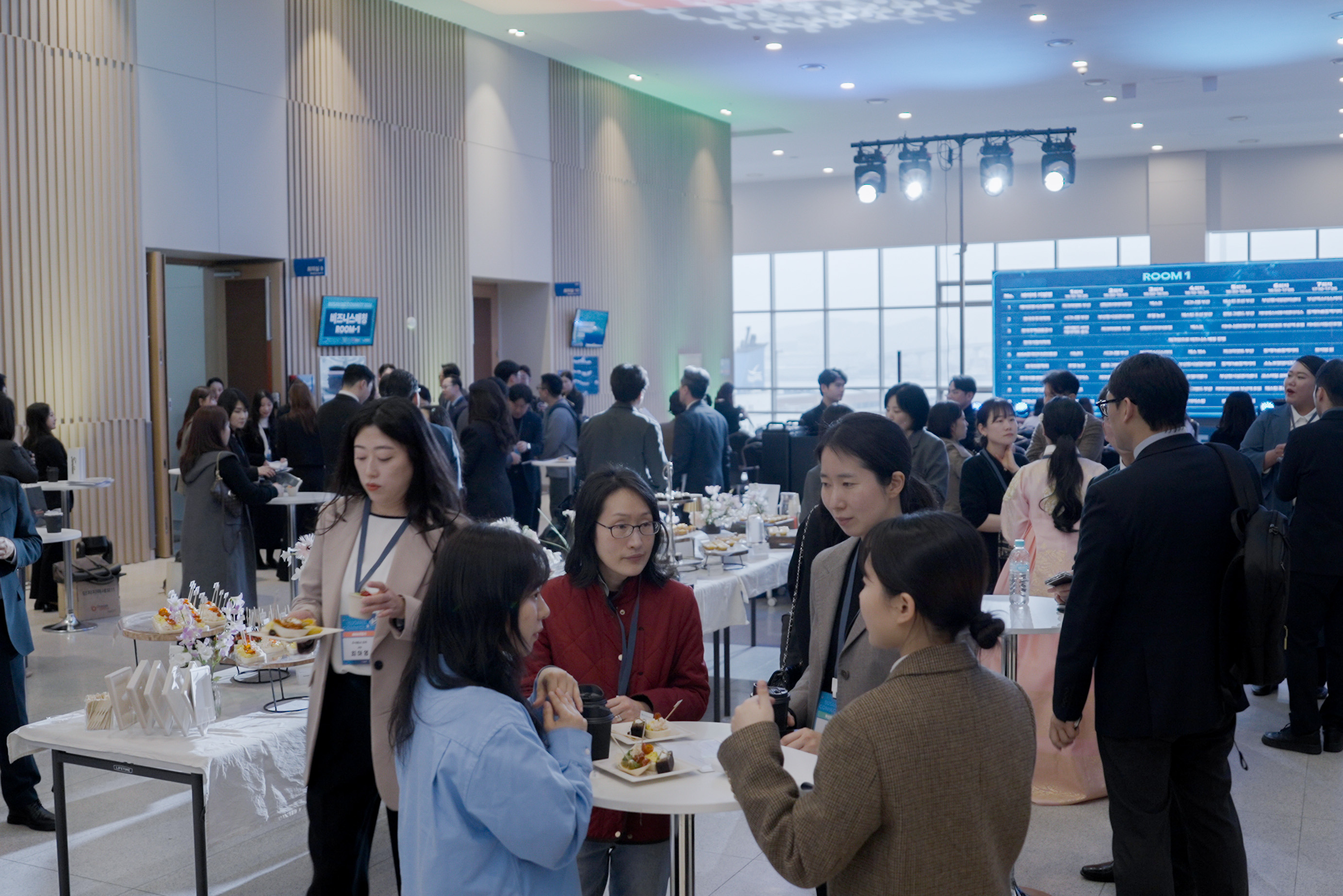 비즈니스 컨퍼런스 휴식 시간 동안 참가자들이 활발하게 네트워킹을 하고 있다.