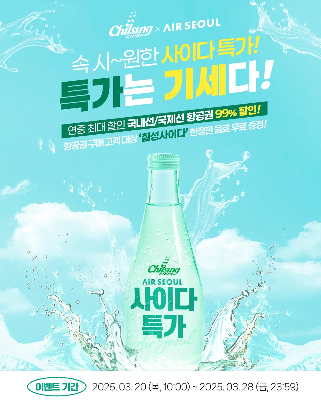 또한 에어서울은 사이다 특가 행사를 기념한 롯데칠성음료와의 제휴를 통해 항공권 구매 고객 중 추첨을 통해 ‘칠성사이다 레트로 우드 패키지’를 증정하는 이벤트도 함께 진행한다.
