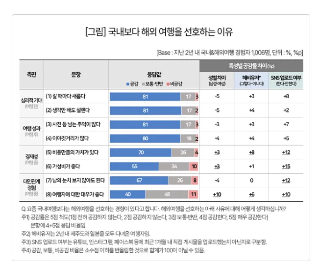 조사에서는 여행의 4개 측면 8개 문항을 제시하고, 각각에 대해 ‘해외여행이 국내여행보다 더 낫다’는 데 공감하는지를 물었다(5점 척도)공감했다는 응답 결과만을 다룬다. 8개 문항은 △‘여행 전 기대’ 2문항 △여행 중 ‘경제성(여행비용)’ 관련 2문항 △‘여행 중 대인관계 경험’ 2문항 △‘여행 후 성과’ 2문항으로 구성됐다. 질문과 답은 “해외여행은 ‘갈 때마다 새롭다’”는 문항에 대해 ‘공감한다(매우, 약간), 중간·보통, 공감하지 않는다(매우, 보통)’로 평가토록 구성했다.