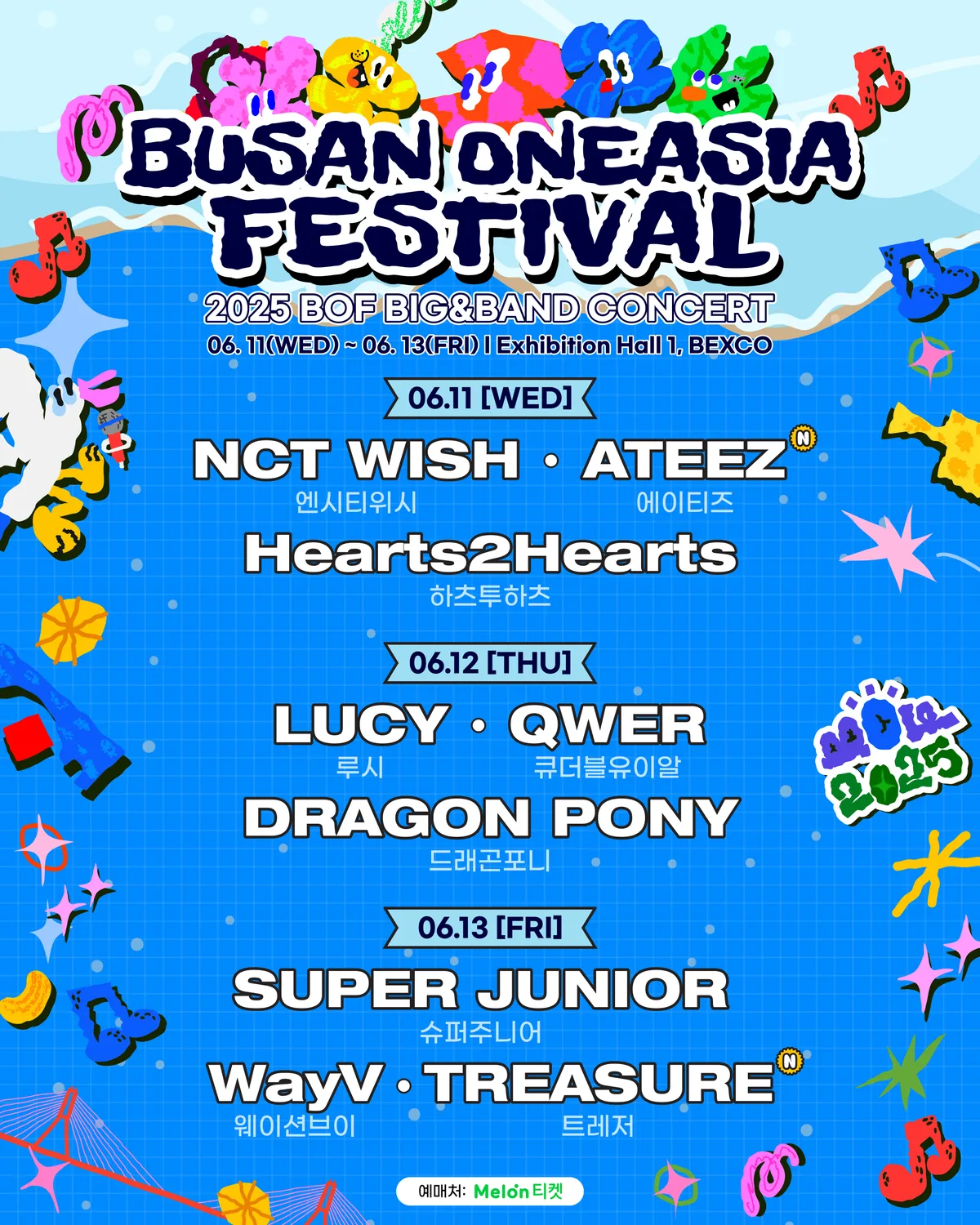 부산시가 주최하고, 부산관광공사와(주)에스엠컬쳐앤콘텐츠가 공동주관 하는 2025 부산원아시아페스티벌(Busan One Asia Festival, 이하 BOF)의 'BOF Big 콘서트' 합류 라인업을 공개했다. 2025 BOF는 6월 11일부터 6월 13일까지 벡스코에서 열리며, 11일과 13일은 글로벌 팬덤을 보유한 K-POP 아티스트와 함께하는 BIG 콘서트와 12일은 K-POP 밴드의 에너지 넘치는 공연이 진행될 예정이다.