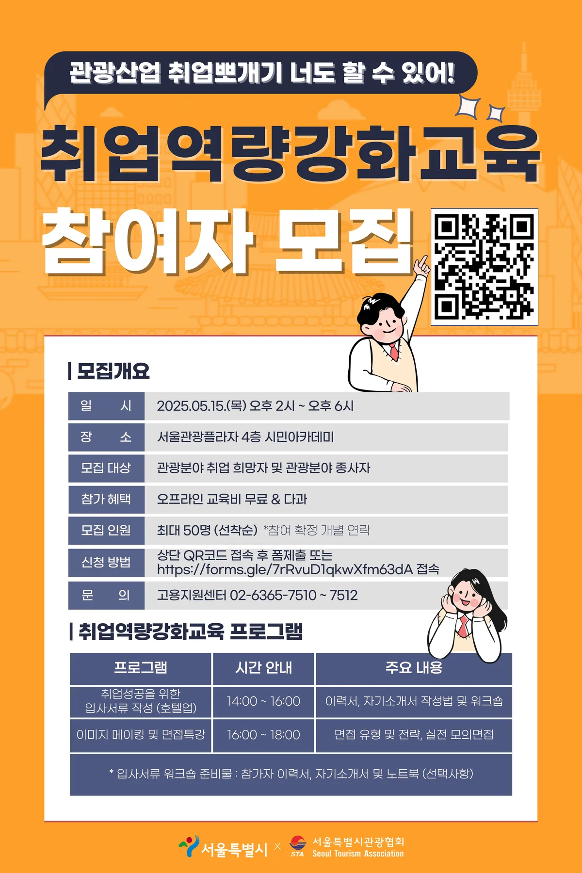 교육 신청 접수는 구글폼(https://forms.gle/7rRvuD1qkwXfm63dA)을 통해 신청할 수 있으며, 보다 자세한 사항은 STA 서울관광고용지원센터(02-6953-7510~7512)에 문의하면 된다.