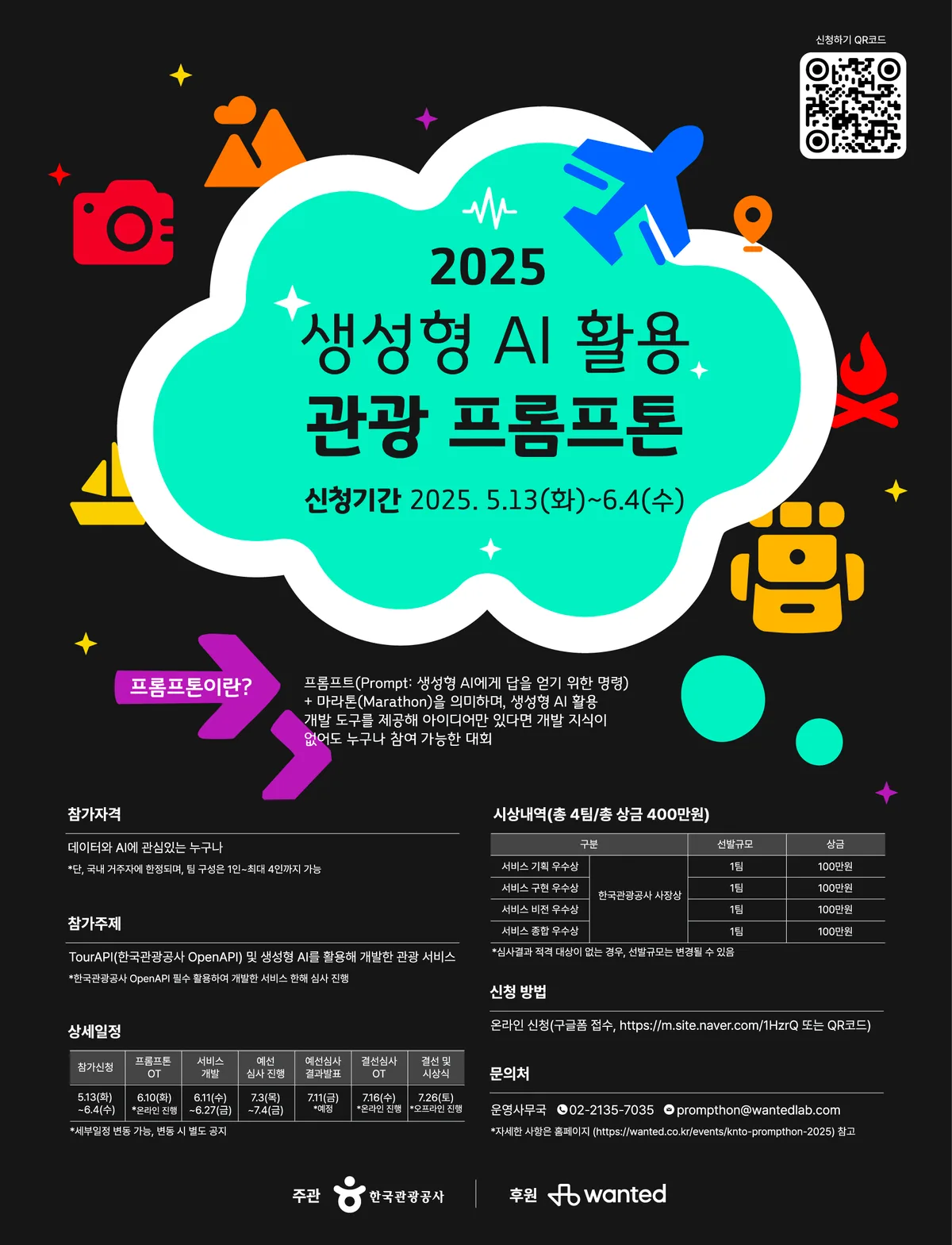 한국관광공사(사장직무대행 서영충, 이하 공사)는 관광데이터와 생성형 AI를 통해 창의적인 관광서비스를 발굴하기 위하여 ‘2025 관광 프롬프톤’을 개최한다.