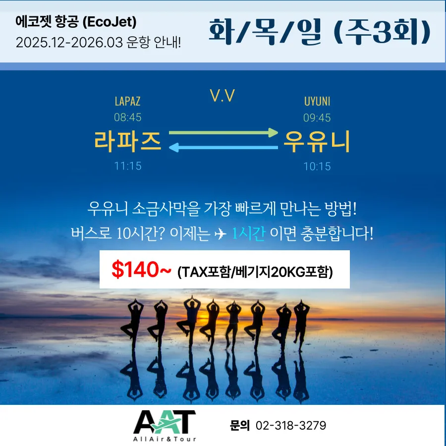 볼리비아 지역 항공사 에코젯(EcoJet)이 오는 2024년 12월부터 라파즈(La Paz)와 우유니(Uyuni)를 연결하는 직항 노선을 주 3회(화·목·일) 운항한다.