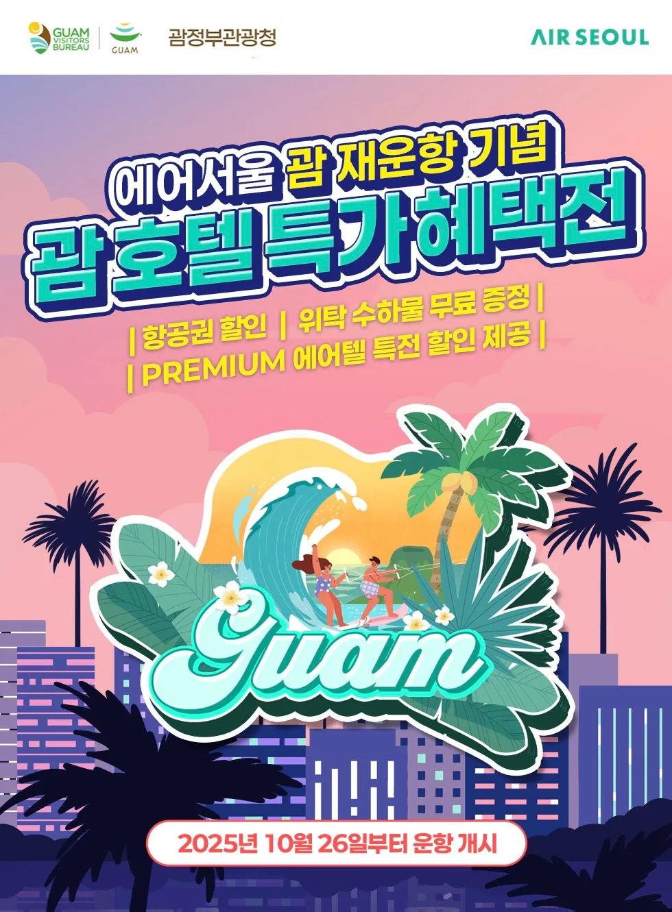 에어서울 관계자는 “그동안 많은 사랑을 받았던 에어서울의 괌 노선을 다시 선보일 수 있게 되었다”라며 “다채로운 혜택과 함께 안전하고 편안한 서비스를 제공하기 위해 최선을 다하겠다”라고 전했다.