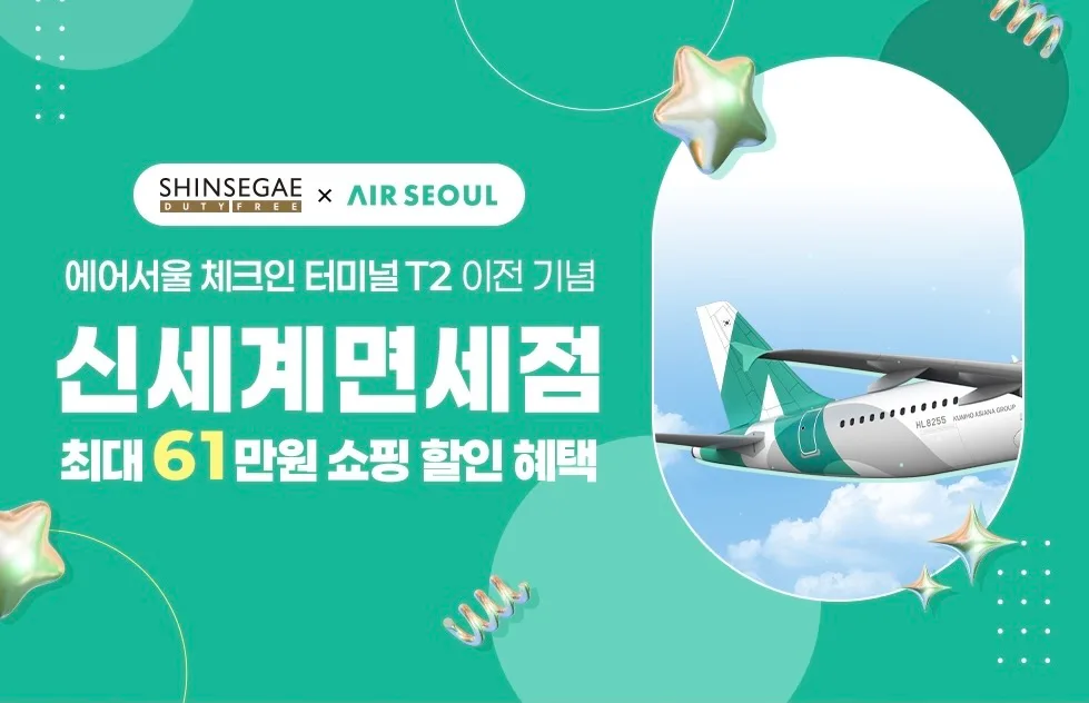이와 더불어 에어서울 단독 혜택으로 신세계면세점 최대 7만 원 할인 쿠폰을 제공하며, 해당 쿠폰은 인천국제공항 에어서울 체크인 카운터(E1~E10)에서 수령할 수 있다.