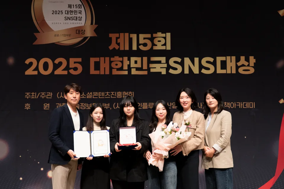 지난 16일 열린 제15회 2025 대한민국 SNS 대상 시상식에서 하나투어 양성회 고객경험본부장(오른쪽 두 번째)가 SNS 콘텐츠 담당자들과 기념 촬영을 하고 있다.