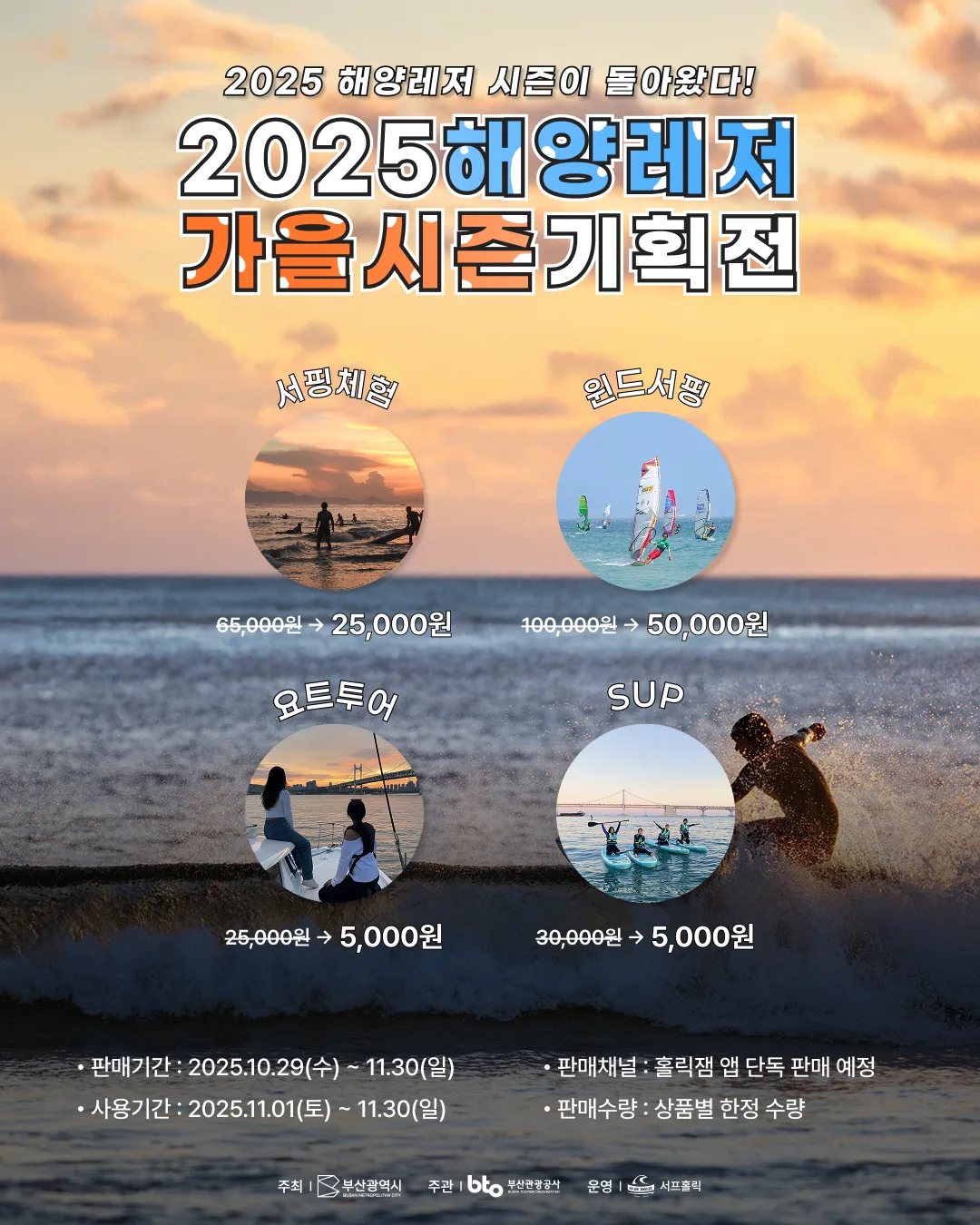이번 프로모션은 ▲서핑 ▲요트 ▲SUP(패들보드) ▲윈드서핑 등 부산을 대표하는 해양레저 종목을 최대 80% 할인된 가격으로 즐길 수 있도록 구성돼, 시민과 관광객 누구나 부담 없이 체험할 수 있다.
