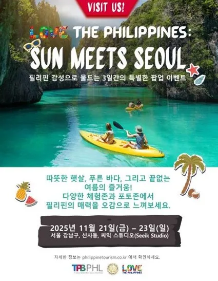 필리핀 관광부는 오는 21일부터 23일까지 서울 강남구 신사동 가로수길에 위치한 씨익 스튜디오 (Seeik Studio)에서 특별 팝업 이벤트 “LOVE THE PHILIPPINES: SUN MEETS SEOUL” 를 개최한다.