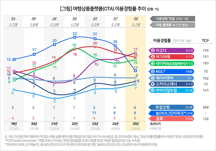 국내 소비자의 온라인여행상품플랫폼(OTA) 이용경험률에서 ‘아고다’가 처음으로 1위에 올랐다. 조사 시작 이후 줄곧 1위를 지켜온 ‘NOL(구 야놀자)’은 4위로 내려앉았다. 야놀자에서 NOL로의 브랜드 전환에 따른 일시적 현상으로 추정되나, 상위권 브랜드간 경쟁 구도 재편 가능성도 엿보인다.여행조사 전문 기관 컨슈머인사이트가 2016년부터 매년 9월 수행하는 ‘연례 여행 만족도 조사’에서 최근 1년간(’24년 9월~’25년 8월) 온라인 여행상품 플랫폼 이용 경험이 있는 소비자(1만2826명)에게 어떤 플랫폼을 알고 있는지, 이용해 봤는지 묻고 추이를 비교했다.
