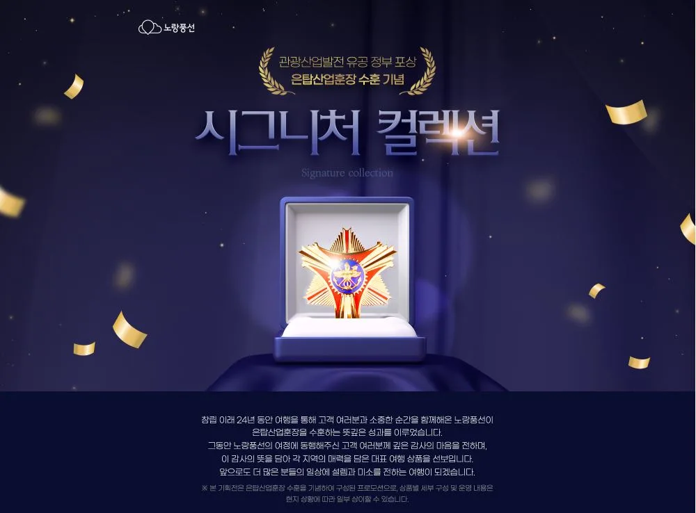 노랑풍선 관계자는 “은탑산업훈장 수훈은 고객과 함께 만들어낸 성과”라며 “이를 기념해 준비한 시그니처 컬렉션을 통해 노랑풍선만의 상품 경쟁력과 차별화된 여행 서비스를 경험하길 바란다”고 말했다.