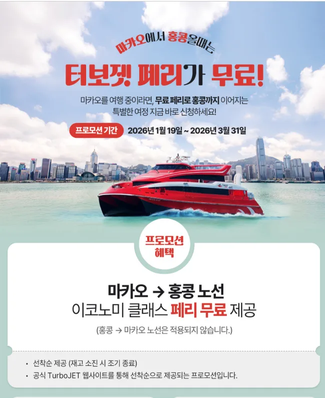 ·이용 방법 : TurboJET 공식 웹사이트 사전 신청 후, 지정 카운터에서 실물 티켓 교환 (선착순, 재고 소진 시 종료)