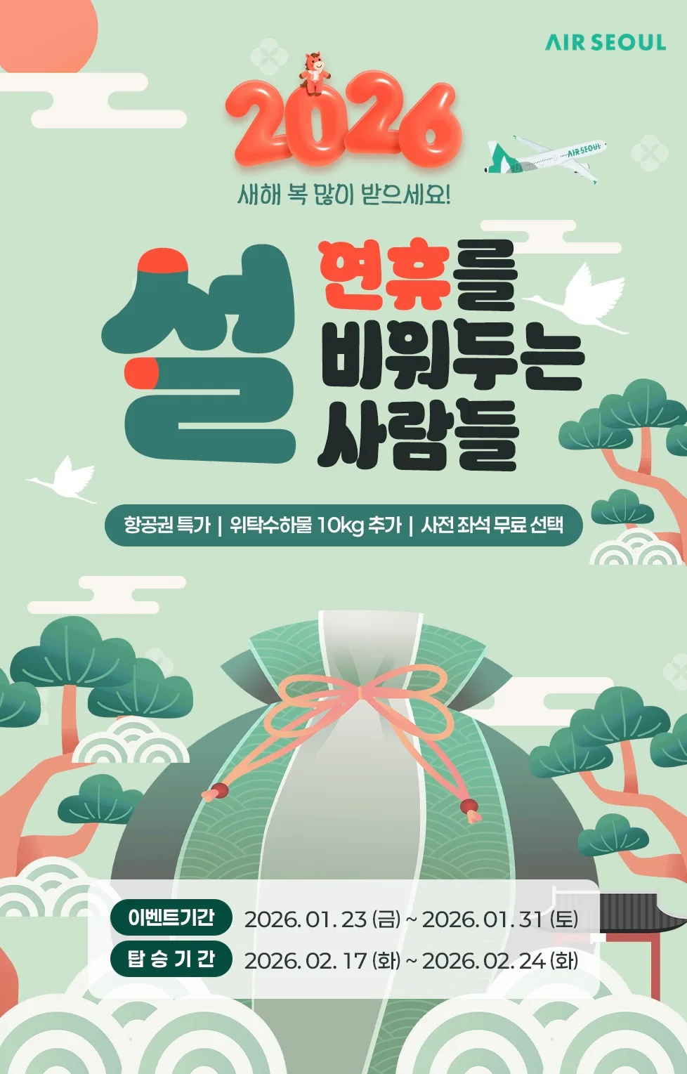 설 연휴는 이동 수요가 몰리며 항공편과 공항 이용이 상대적으로 혼잡해지는 시기다. 에어서울은 연휴 전·후에 여행하는 고객을 대상으로 항공권 할인, 수하물, 좌석 등 실질적인 혜택을 제공함으로써 원활한 항공 여행 환경을 조성하는 데 초점을 맞췄다.