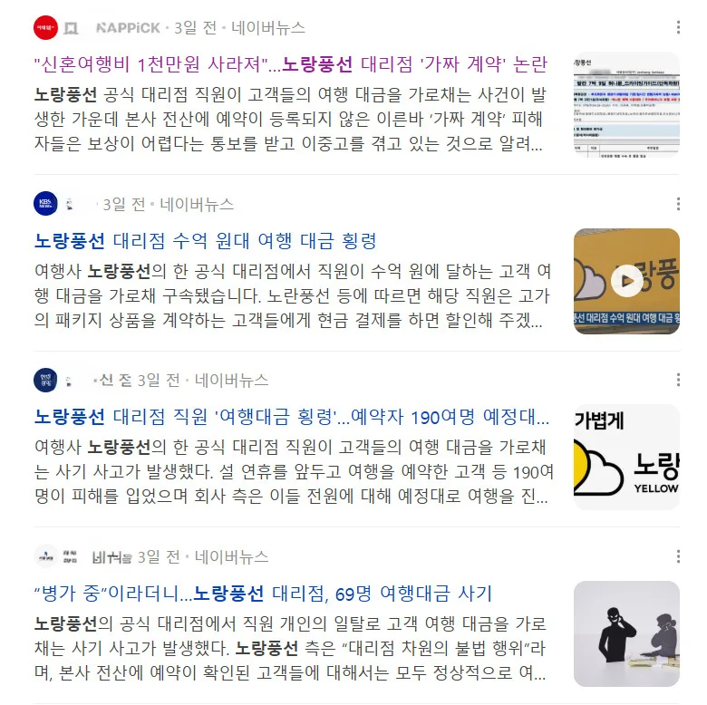 노랑풍선 강동구 대리점 직원의 횡령사건이 보도된 내용들 (사진은 네이버뉴스에 보도된 내용들 캡처사진)