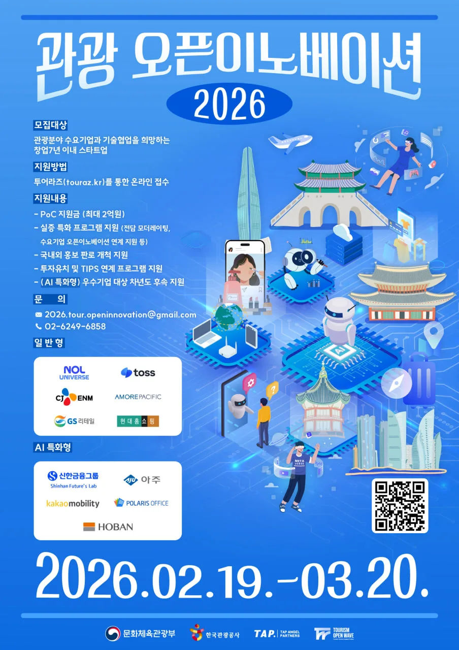 문화체육관광부와 한국관광공사(이하 ‘공사’)는 오는 3월 20일까지 ‘2026 관광 오픈이노베이션 사업’ 공모를 통해 대·중견기업과 협업할 관광 스타트업을 모집한다.