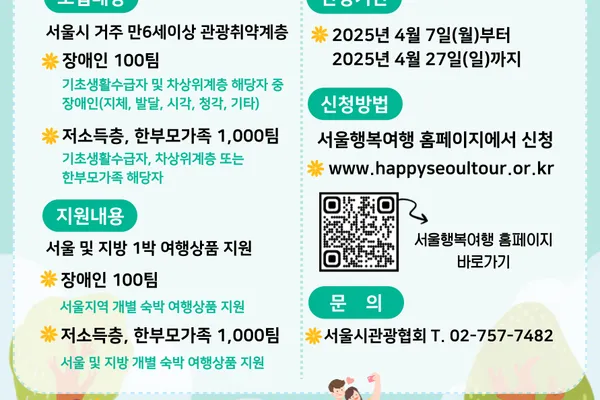 서울특별시관광협회(회장 조태숙)가 서울시와 함께 관광취약계층의 관광 향유권 확대와 약자와의 동행 실천을 위한 '2025 서울행복여행' 참여자 모집을 시작했다.