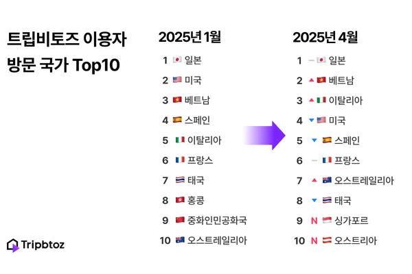 영상 기반 여행 플랫폼 트립비토즈는 2025년 1월과 4월 자사 예약 데이터를 기반으로, 여행 트렌드가 어떻게 변화했는지를 분석했다.