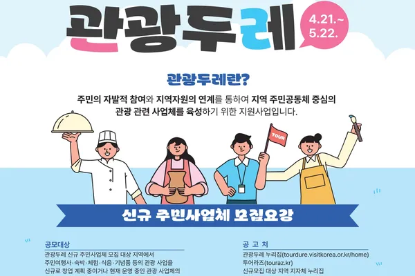 문화체육관광부와 한국관광공사(이하 공사)는 21일부터 5월 22일까지 ‘관광두레’에 참여할 주민사업체를 모집한다.