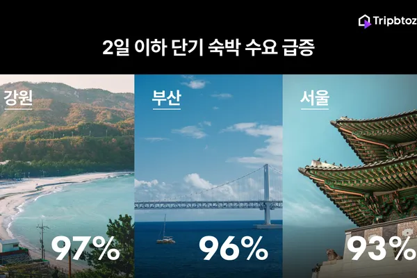 트립비토즈 플랫폼의 최근 6개월간 데이터를 보면, 강원은 2일 이하 투숙 비율이 97%로 가장 높았고, 부산(96%)과 서울(93%)이 뒤를 이었다.