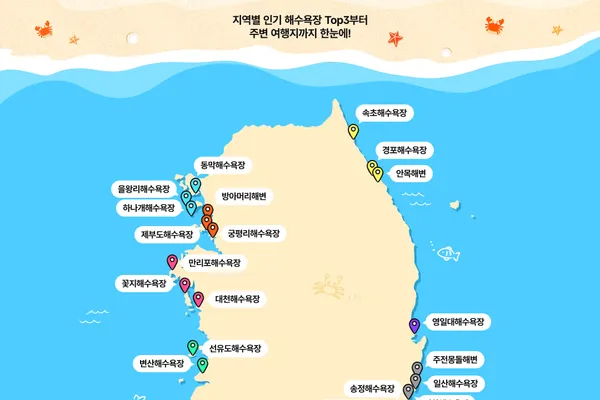 한국관광공사(사장직무대행 서영충, 이하 ‘공사’)는 카카오모빌리티와 함께 지난해 여름, 국민이 많이 찾았던 해수욕장 27곳을 한눈에 볼 수 있도록 ‘가볼만할지도 여름 해변 편(이하 ’여름 해변 지도‘)’을 선보였다.