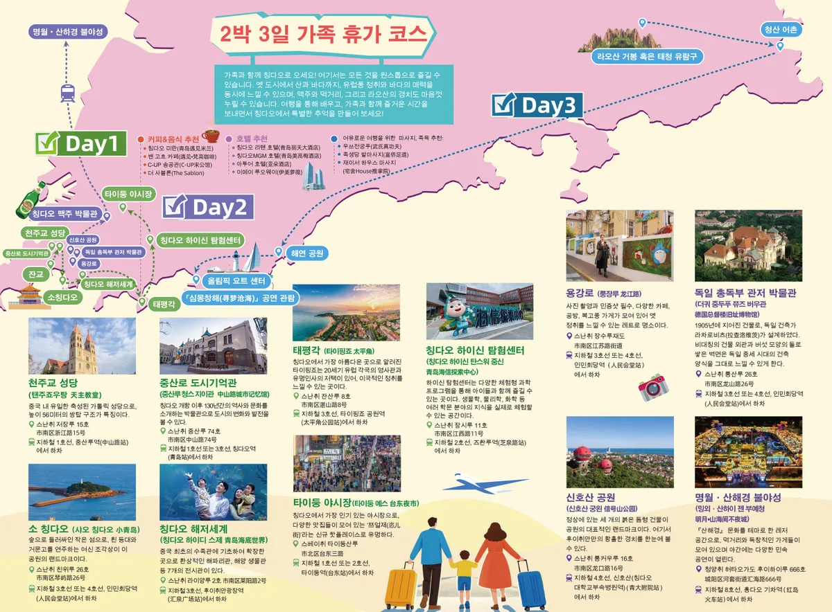 '2박 3일 가족 휴가 코스'는 가족 여행객을 위해 아이들이 보다 즐길 수 있는 코스로서, 첫째 날은 잔교, 중산로 도시기억관, 천주교 성당, 소칭다오, 칭다오 해저세계, 태평각, 칭다오 하이신 탐험센터, 타이둥 야시장을, 둘째 날은 용강로, 독일총독부 관저 박물관, 신호산 공원, 칭다오 맥주박물관, 명월·신야경 불야성을, 셋째 날은 라오산 거봉 혹은 태청 유람구, 청산 어촌, 해연 공원, 올림픽 요트 센터, 심몽창해 공연 관람의 일정이다.
