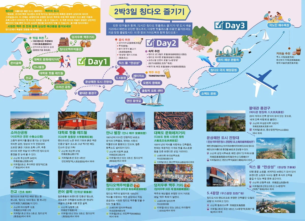 '2박 3일 칭다오 즐기기'는 옛 거리부터 모던한 명소가지 칭다오의 핫플레이스를 원없이 즐기는 코스다. 첫째 날은 소어산 공원, 대학로 핫플 레드월, 잔교, 은어골목, 안나별장, 대북도 문화레저거리, 칭다오맥주박물관, 덩저우루 맥주거리를, 둘째 날은 팔대관 풍경구, 운상해천 도시전망대, 만상성, 5.4광장, 레이저쇼, 오렌지 항해로, 올림픽 요트센터, 연인 등대길을, 셋째 날은 칭다오 극지 해양공원, 극지 해상 관람차, 소맥도 공원, 석노인 해수욕장을 방문하며 칭다오의 핵심 관광지를 모두 돌아보는 일정으로 구성했다.