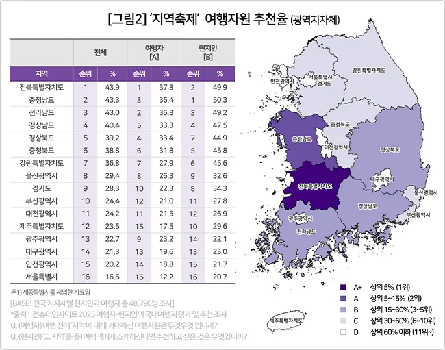 광역지자체 기준으로는 전북특별자치도(43.9%), 충청남도(43.3%), 전라남도(43.0%)가 나란히 1~3위를 차지했다[그림2]. 그 뒤로는 경상남도(40.4%), 경상북도(39.2%), 충청북도(38.8%), 강원특별자치도(36.8%)가 중상위권에 포진했다. 모두 비수도권 광역도 지역이다. 제주특별자치도(23.5%, 12위)는 도 지역 중 유일하게 10위권 밖에 머물렀다. 축제 외에도 다양한 여행자원을 갖춘 제주도의 특수성이 반영된 결과로 보인다.