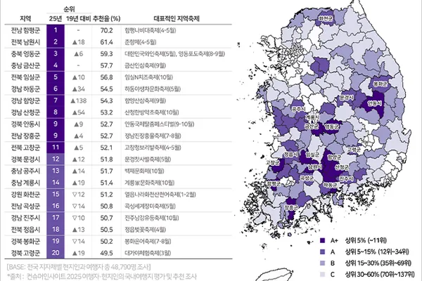 지역축제가 재래시장 다음으로 많은 추천을 받은 주요 여행자원으로 부상했다. 코로나 시기 주춤했던 여행자와 현지인의 추천율이 급등하면서 ‘산·계곡’을 추월해 처음으로 2위가 됐다. 상대적으로 여행 콘텐츠가 부족한 ‘군’ 단위 내륙·산악 지역이 대부분 상위권을 차지해 낙후된 지역 여행환경에 활력소 역할도 기대된다.