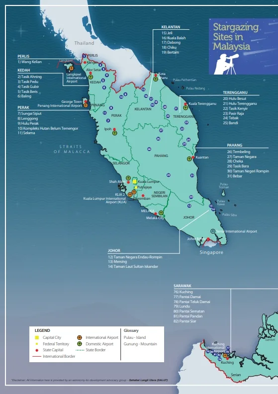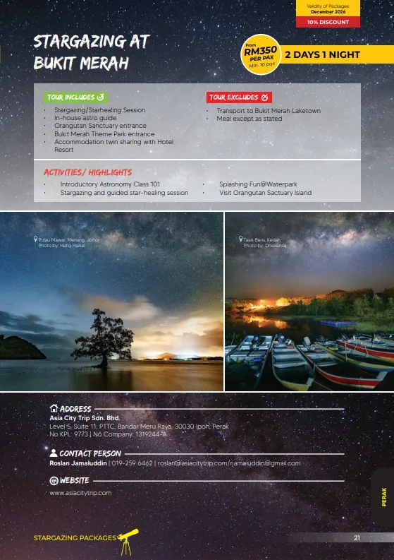 이번 패키지는 말레이시아 전역의 대표적인 별빛 명소를 아우른다. 부킷 메라(Bukit Merah), 팡칼란 발락 해변(Pantai Pengkalan Balak), 데사루(Desaru), 펄리스(Perlis), 톡발리 해변(Pantai Tok Bali) 등 천문 관측에 최적화된 지역들이 포함되어 있으며, 말레이시아는 적도 인근에 위치해 북반구와 남반구의 별자리를 한밤중에 모두 관측할 수 있는 드문 지리적 장점을 지니고 있다.