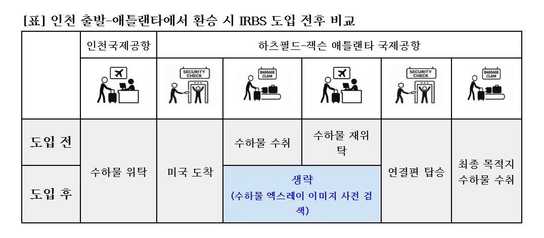 우선 인천국제공항에서 IRBS 실시 항공편을 이용하는 승객은 애틀랜타국제공항 도착 시 수하물 임의 개봉 검색과 세관 검사를 면제받고 보다 빠르게 입국하는 혜택을 누릴 수 있다.
