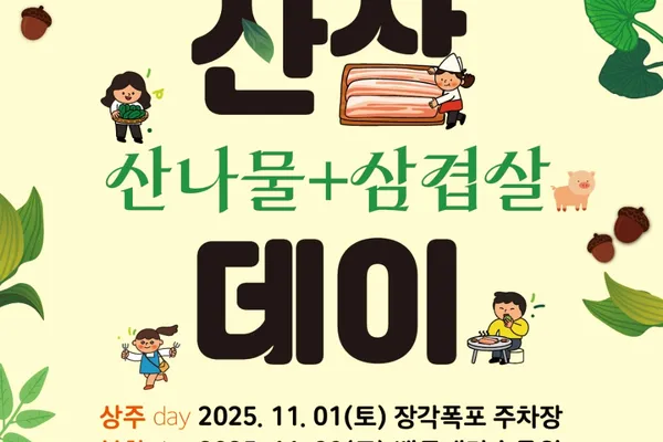 경상북도문화관광공사(사장 김남일, 이하 공사)는 경북 북부권 산림관광 활성화를 위해 ‘산삼(산나물+삼겹살)데이’ 행사를 오는 11월 1일(토)과 11월 29일(토), 총 2회에 걸쳐 상주시 장각폭포와 봉화 백두대간수목원 일원에서 개최한다.