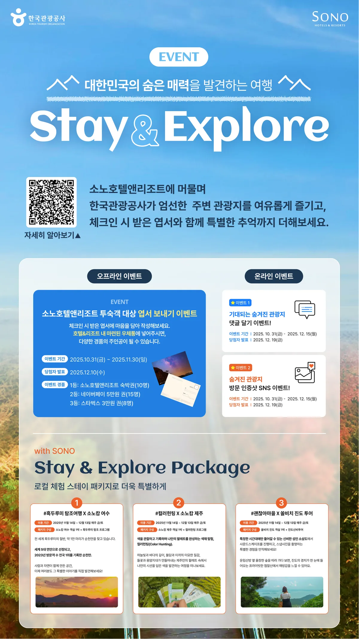 한편, 공사는 10월 31일부터 12월 16일까지 홍천 비발디파크에서 ‘여행가는 가을’과 연계한 팝업스토어를 운영한다. 대한민국 관광공모전(사진 부문) 수상작을 만나볼 수 있으며, 국내 여행지 할인 혜택을 제공하는 다양한 프로그램을 준비했다. 또한, 디지털 관광주민증 신규 가입자에게는 최소 1만 원에서 최대 100만 원 상당의 여행 경품 당첨 기회를 제공하는 ‘이달의 여행운’ 이벤트(~11월 28일)도 진행된다.