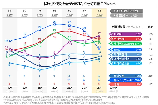 ‘23년 이후 3년간의 OTA 이용경험률(59%→57%→56%)이나 이용 브랜드 수(2.2개→2.1개→2.1개)를 봐도 시장은 성장기를 지나 정체기에 접어들었다.