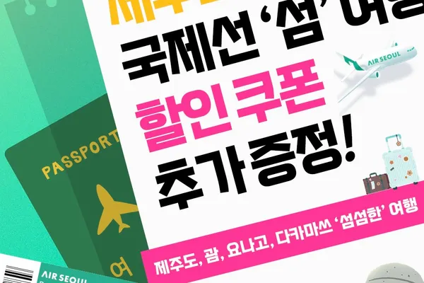 오는 12월 31일까지 김포~제주 왕복 항공권에 프로모션 운임이 적용되며, 에어서울 인스타그램 이벤트 참여시 5% 추가 할인 쿠폰을 제공한다.