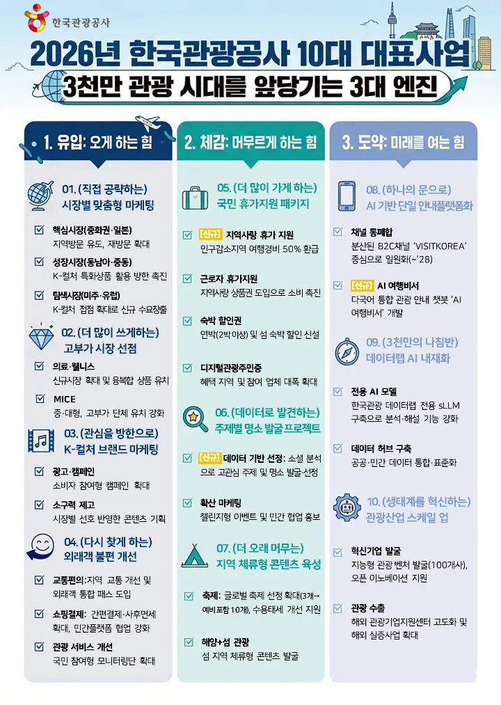 공사는 2026년을 3천만 명 유치 달성을 위한 ‘실행 원년’으로 설정하고, ‘더 많이 오고, 더 오래 머물며, 미래를 여는 관광산업’으로의 전환을 목표로 10대 대표사업을 집중 추진한다.