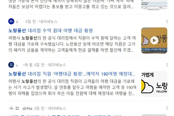 노랑풍선 강동구 대리점 직원의 횡령사건이 보도된 내용들