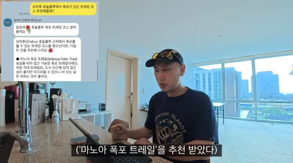 유튜버 ‘방랑자 차박차박’이 하와이에서 카카오톡 AI 가이드 ‘레이(Lei)’를 활용해 여행 정보를 확인하는 모습.