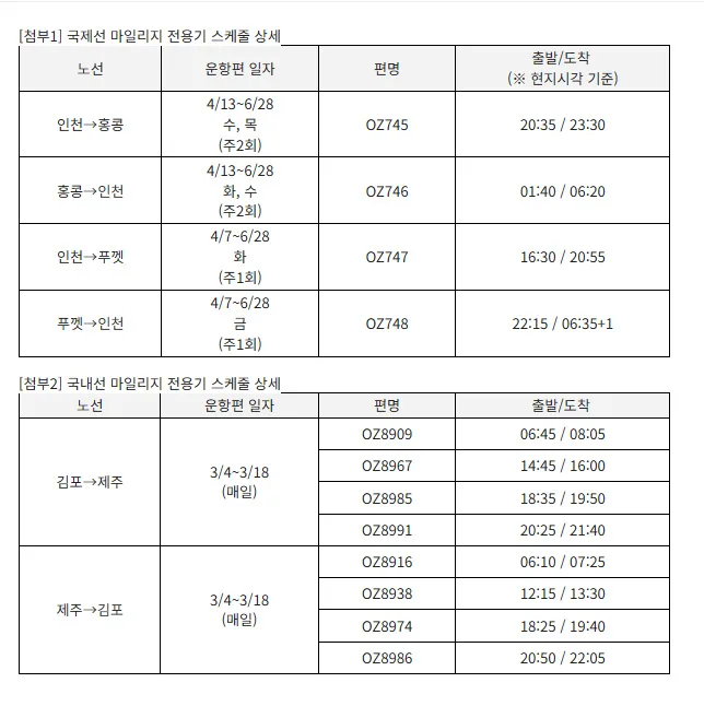 또한, 아시아나항공은 2월 25일(수)부터 국내선 제주 노선 마일리지 전용기 예약을 오픈했다. 이번 국내선 마일리지 전용기는 3월 4일(수)부터 18일(수)까지 운영되며, 매일 김포발 제주행 4편, 제주발 김포행 4편 총 120편의 항공편에서 마일리지 좌석이 최대한 공급된다. 국제선 마일리지 전용기와 마찬가지로 잔여 좌석 상황에 따라 유상 좌석으로도 판매 된다. ※ 세부 스케줄은 [첨부2] 참조